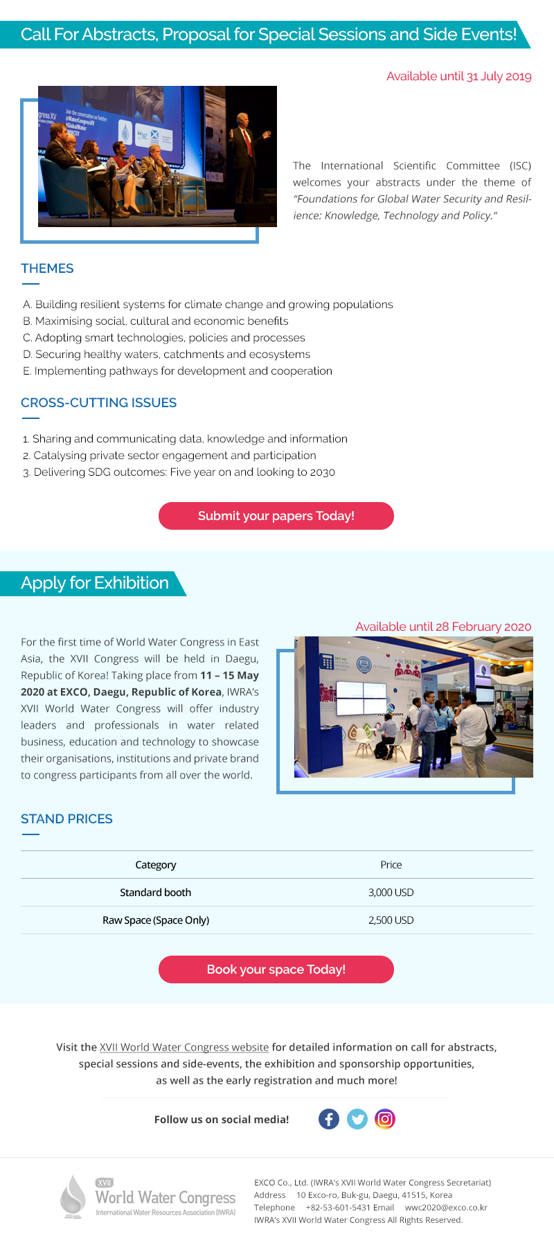 공지글 New Dates: IWRA’s XVII World Water Congress (29 November – 3 December 2021)! 2021.03.19 admin 2021.03.19 269
