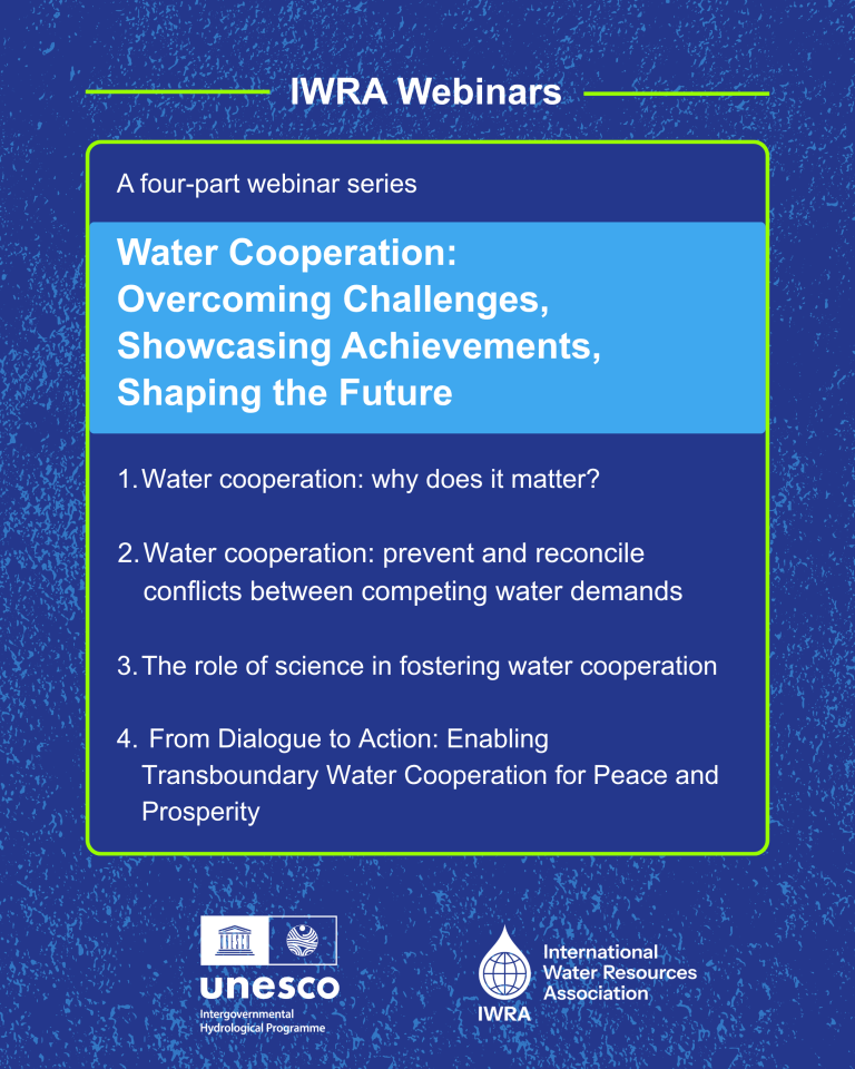 The IWRA webinar series organised in coordination with UNESCO-IHP in the framework of UN-Water aims to contribute to the 2026 UN Water Conference. The series focuses on one of the most pressing challenges in global water governance: Water Cooperation.