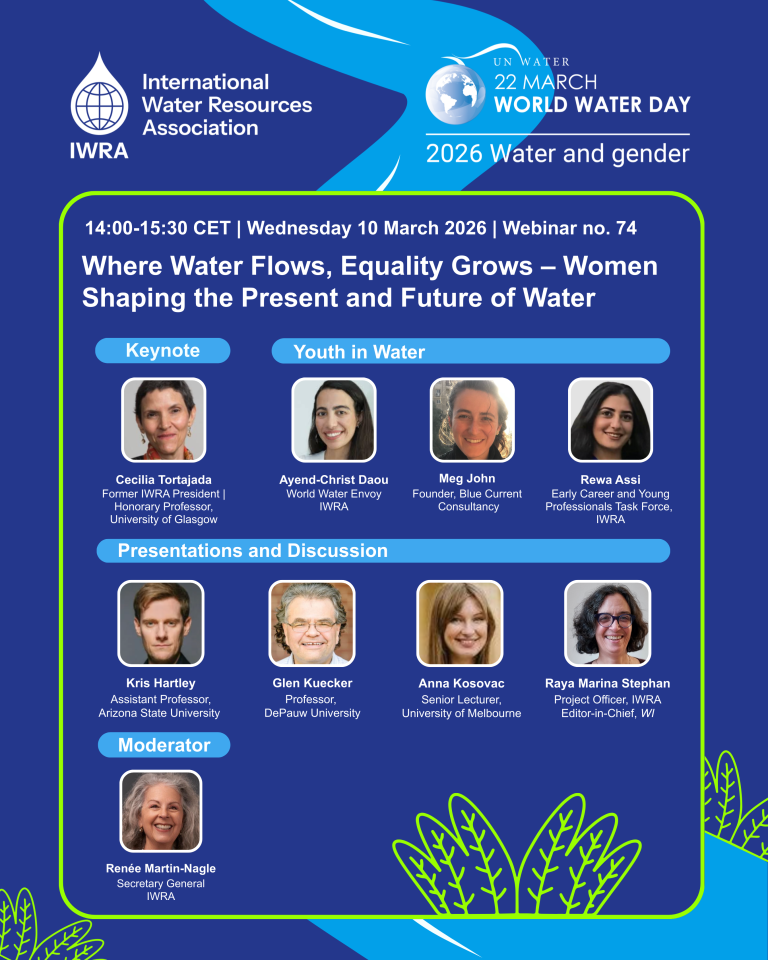 - Raya Marina Stephan, Editor-in-Chief of Water International and IWRA Project Officer, leading the upcoming report on “Water and Gender: Towards women’s equal rights and opportunities”.